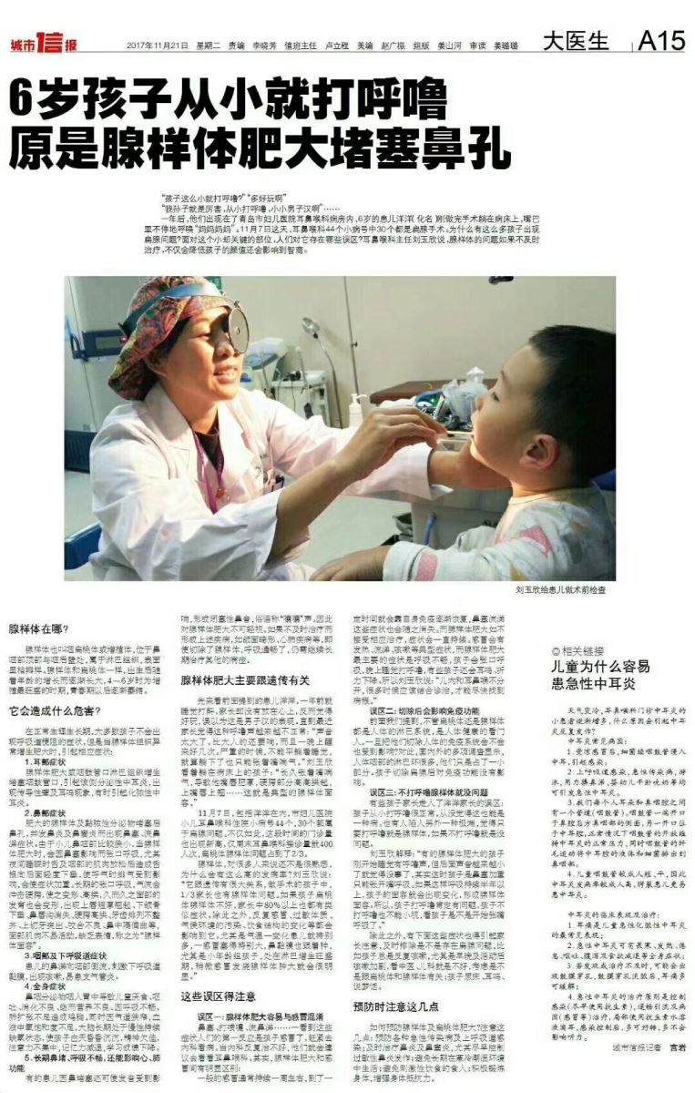 一年后,他們出現(xiàn)在了青島市婦兒醫(yī)院耳鼻喉科病房?jī)?nèi),6歲的患兒洋洋(化名)剛做完手術(shù)躺在病床上,嘴巴里不停地呼喚“媽媽媽媽”。11月7日這天,耳鼻喉科44個(gè)小病號(hào)中30個(gè)都是扁腺手術(shù)。為什么有這么多孩子出現(xiàn)扁腺問(wèn)題?面對(duì)這個(gè)小卻關(guān)鍵的部位,人們對(duì)它存在哪些誤區(qū)?耳鼻喉科主任劉玉欣說(shuō),腺樣體的問(wèn)題如果不及時(shí)治療,不僅會(huì)降低孩子的顏值還會(huì)影響到智商。