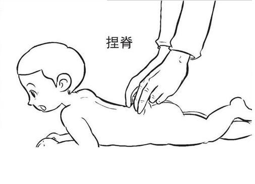 捏脊:在患兒背部,沿脊柱兩側(cè),從尾椎骨捏向頸椎,三至五遍。