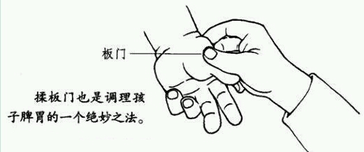 揉板門:板門穴,在患兒左手大魚際。用揉法,力量滲透到皮下肌層,不在皮膚表面摩擦。