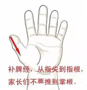 補(bǔ)脾:脾穴,在患兒左手拇指,從指尖到指根赤白肉際交界處,線形穴。手法為從指尖推向指根。