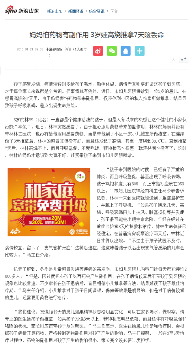 新浪:媽媽怕藥物有副作用 3歲娃高燒推拿7天險(xiǎn)丟命