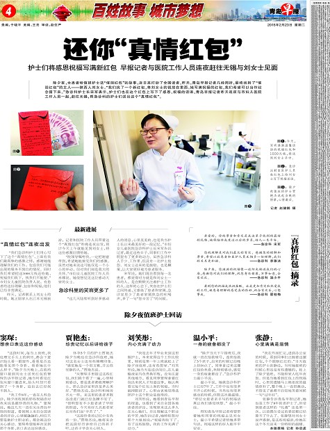 除夕夜,女患者給值班護(hù)士送“催淚紅包”的故事,近日來打動(dòng)了全國(guó)讀者。昨天,青島早報(bào)記者幾經(jīng)周折,最終找到了“催淚紅包”的主人——陜西人劉女士。“我們找了一個(gè)新紅包,將劉女士的錢放在里面。她寫滿祝福的紅包,我們希望可以當(dāng)作紀(jì)念留下來。”急診科護(hù)士長(zhǎng)宋軍表示,護(hù)士們也在這個(gè)紅包上寫下了感恩、祝福的話語,青島早報(bào)記者昨天連夜與市婦兒醫(yī)院工作人員一起,趕往無錫,幫急診科的護(hù)士們送出這個(gè)“真情紅包”。
