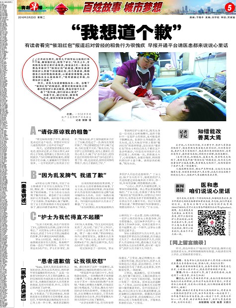 昨天,還有幾位讀者像陳先生一樣,在看了“催淚紅包”的報道后,想要對曾經(jīng)被自己粗 暴對待的護(hù)士表達(dá)歉意。青島早報今天開通了“醫(yī)和患,咱們說說心里話” 溝通平臺,通過短信、微信等 方式,請雙方都來說說看法。