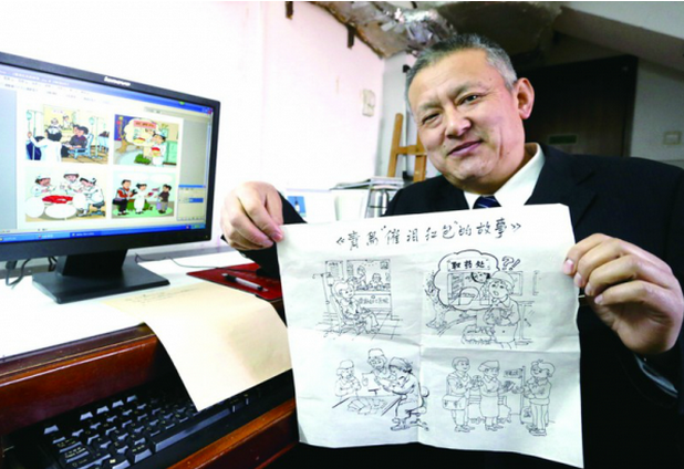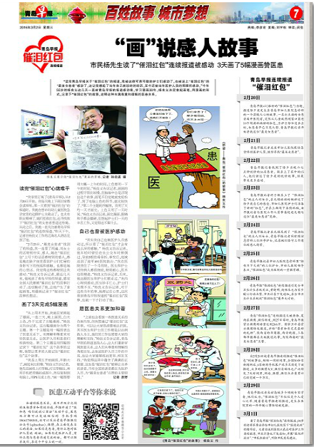 “讀完青島早報關(guān)于‘催淚紅包’的報道,我被這群可親可敬的護(hù)士們感動了,也被送上‘催淚紅包’的‘最美女患者’感動了。這讓我想起了當(dāng)年自己就診時的經(jīng)歷,至今還被當(dāng)年醫(yī)護(hù)人員的照顧所感動。”今年55歲的楊良義這幾天一直被青島早報的報道感動著。學(xué)習(xí)漫畫30年,楊良義決定拿起畫筆,用漫畫的形式,記錄下“催淚紅包”的故事,詮釋這種充滿尊重和理解的醫(yī)患關(guān)系。