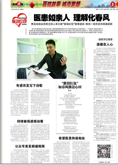 “除夕夜/絢麗的焰火映紅夜空/家人團聚/溫馨滿城/醫(yī)療大廳內(nèi)卻忙碌著白衣天使的身影……”在閱讀了青島早報關(guān)于“催淚紅包”的連續(xù)報道后,青島電視臺青島新聞欄目的主持人單云被這個愛心故事打動,他創(chuàng)作了一首詩,來表達自己的心情,并祝愿醫(yī)患之間能像親人一樣,彼此理解相互尊重。昨天下午,在青島電視臺,單云應(yīng)青島早報記者邀請,朗誦了這首詩,并向記者講述了創(chuàng)作這首詩幕后的故事。