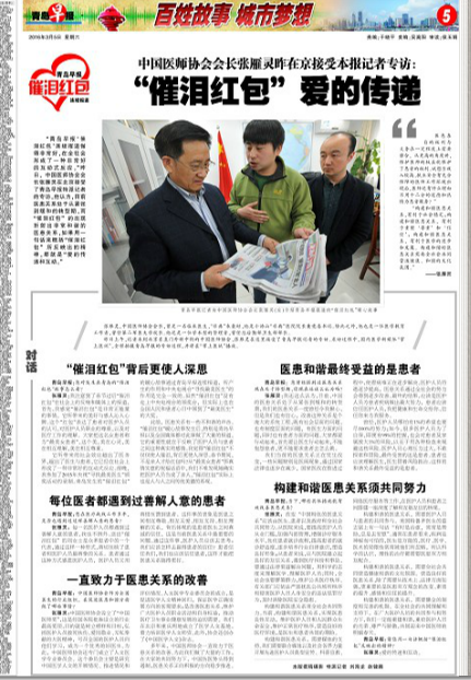 “青島早報‘催淚紅包’連續(xù)報道做得非常好,在全社會形成了一種非常好的互動式反應。”昨日,中國醫(yī)師協(xié)會會長張雁靈在北京接受了青島早報特派記者的專訪,他認為,目前醫(yī)患關(guān)系處于從緊張到緩和的轉(zhuǎn)型期,而“催淚紅包”的出現(xiàn)折射出非常和諧的醫(yī)患關(guān)系,如果用一句話來概括“催淚紅包”所反映出的精神,那就是“愛的傳遞和互動。”