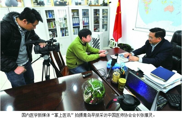 昨日上午,記者來到北京東直門外新中街的中國醫(yī)師協(xié)會,張雁靈在這里接受了青島早報記者的專訪。采訪過程中,國內(nèi)醫(yī)學新媒體“掌上醫(yī)訊”,全程拍攝青島早報的專訪過程,并將在“掌上醫(yī)訊”播放。