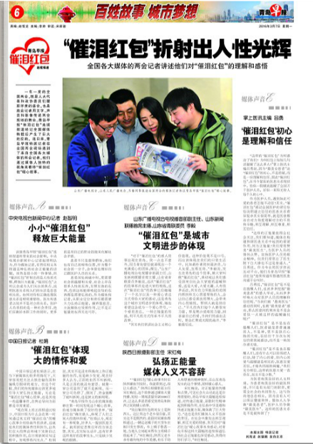 一年一度的全國兩會(huì),既是人大代表和政協(xié)委員們履職盡責(zé)的盛會(huì),也是跑會(huì)記者用文字、聲音和影像傳遞兩會(huì)現(xiàn)場的舞臺(tái)。青島早報(bào)“催淚紅包”連續(xù)報(bào)道經(jīng)過全國媒體轉(zhuǎn)載后產(chǎn)生了巨大的反響。連日來,青島早報(bào)特派記者在全國兩會(huì)現(xiàn)場遇到了來自全國各大媒體的兩會(huì)記者,他們通過媒體人獨(dú)特的視角來看待“催淚紅包”暖心故事。