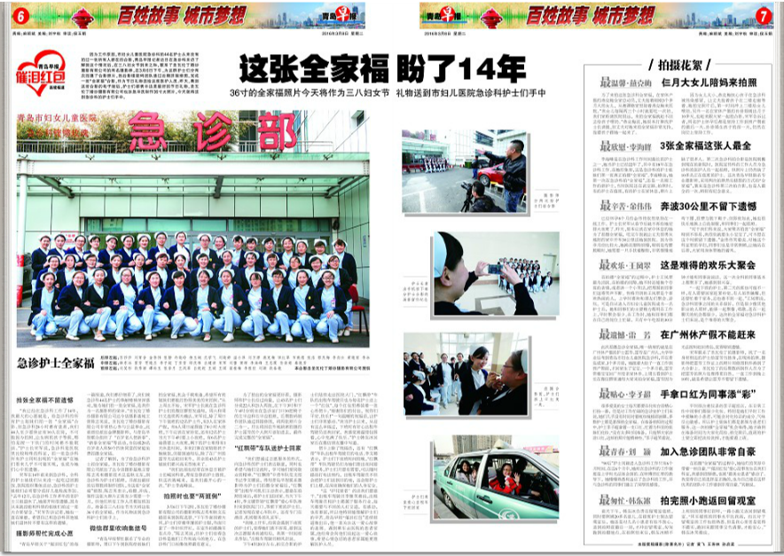 “青島早報幫忙聯(lián)系了專業(yè)的攝影師,周日下午到醫(yī)院給姐妹們拍全家福,機會千載難逢,希望所有的姐妹們都能打扮得美美的來拍照。”從上周五開始,宋軍護士長就在急診科護士們的微信群里發(fā)通知,周六和周日又連續(xù)兩天確認(rèn)。宋軍說,除了周日下午值班的12名護士外,有3人在家休產(chǎn)假,有6人周日凌晨值了8小時大夜班,下午應(yīng)該在家補覺,還有12名護士當(dāng)天下午4時要上小夜班,有6名護士凌晨要上大夜班,剩下的護士難得有1天休息時間,本來打算在家陪陪孩子做做飯,但接到通知后,除了在廣州的雷芳無法趕回來外,其余的43名護士姐妹們都興高采烈地來了。