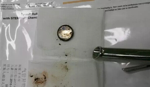 11點10分,患兒接入手術(shù)室,麻醉師和護理人員一邊安撫患兒、守護在患兒身邊,一邊進行麻醉處置和各項護理操作,整個手術(shù)間彌漫著緊張的氣氛。因為患兒年齡太小,最小號的食道鏡在進入食道時也遇到了很大的阻力,2.2厘米大的異物只能和食道鏡一起撤出,經(jīng)過手術(shù)醫(yī)生的反復(fù)努力,食道鏡下發(fā)現(xiàn)電池卡在食道入口下方約2厘米處,后電池被順利取出,此時在場的醫(yī)護人員松了一口氣并將好消息及時通知了家長。