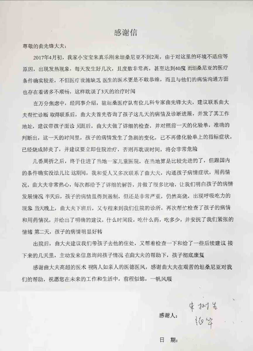 一封感謝信跨越萬里,從坦桑尼亞寄到了中國青島。信中的主人是一名在坦華人,信的字里行間表述著對青島市婦兒醫(yī)院赴坦醫(yī)療援助醫(yī)生曲先鋒的感謝之情。