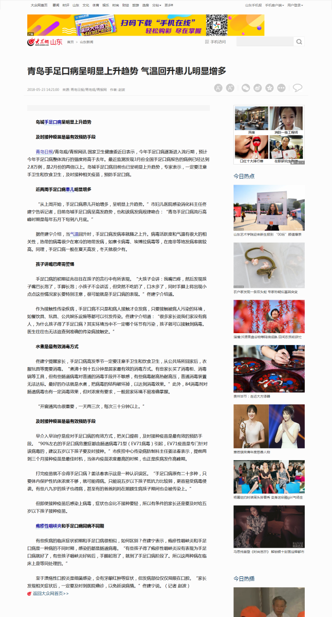 大眾網(wǎng):青島手足口病呈明顯上升趨勢,氣溫回升患兒明顯增多