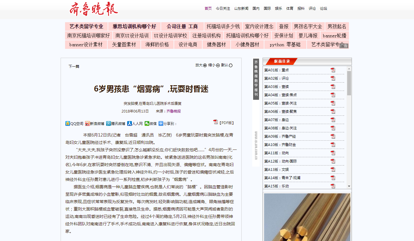 齊魯晚報:6歲男孩患“煙霧病”,玩耍時昏迷