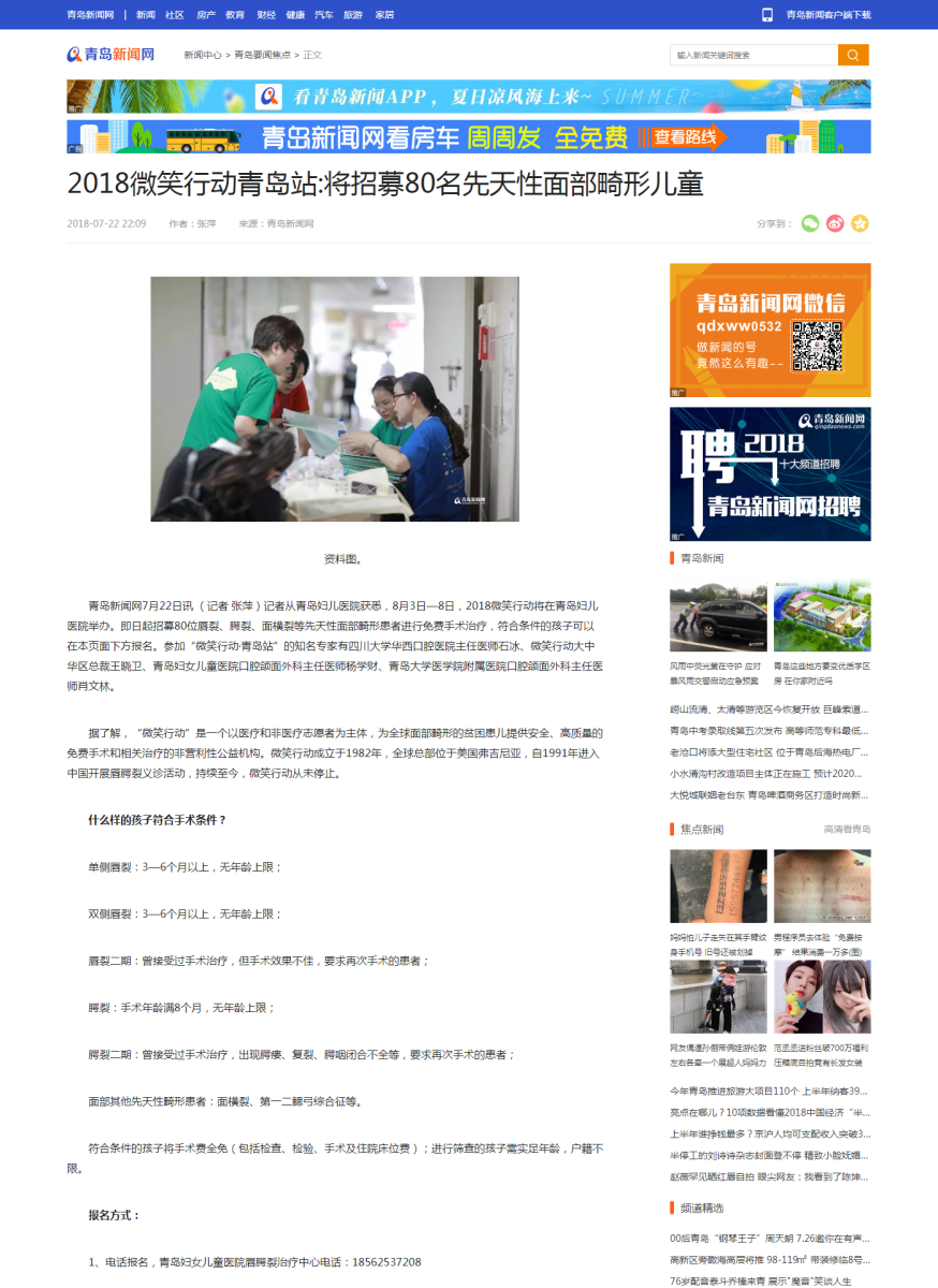 青島新聞網:2018微笑行動青島站:將招募80名先天性面部畸形兒童