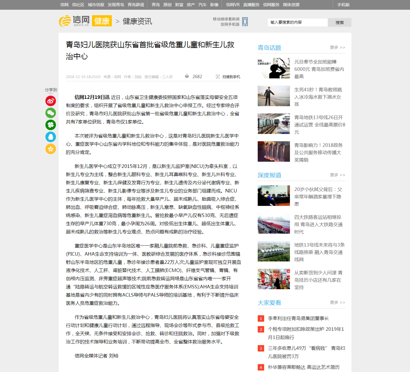 信網(wǎng):青島婦兒醫(yī)院獲山東省首批省級危重兒童和新生兒救治中心