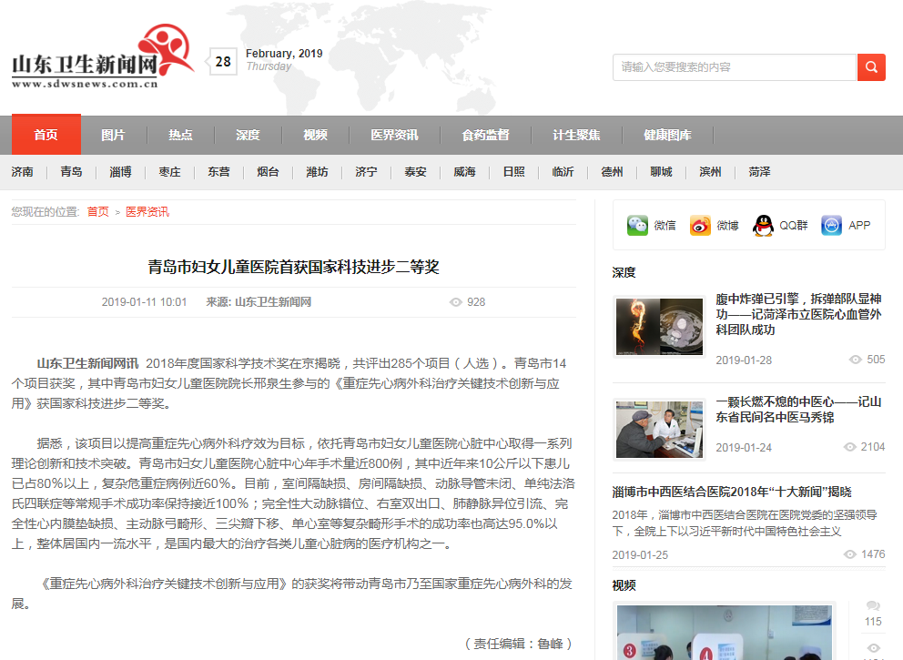 山東衛(wèi)生新聞網(wǎng):青島市婦女兒童醫(yī)院首獲國家科技進(jìn)步二等獎(jiǎng)