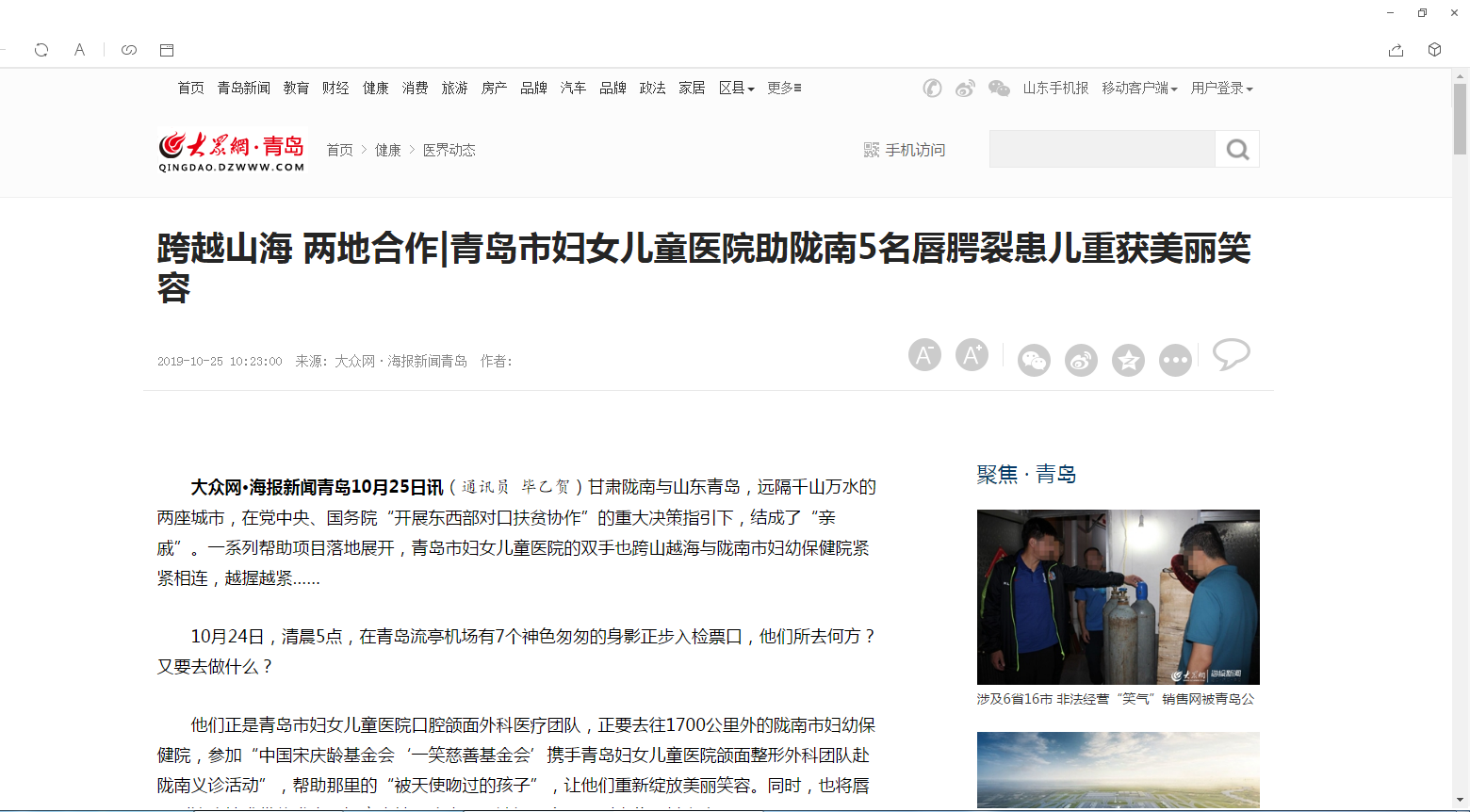 大眾網(wǎng):跨越山海 兩地合作|青島市婦女兒童醫(yī)院助隴南5名唇腭裂患兒重獲美麗笑容
