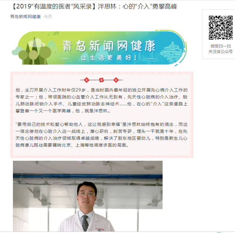 青島新聞網(wǎng):【2019“有溫度的醫(yī)者”風(fēng)采錄】泮思林:心的“介入”勇攀高峰