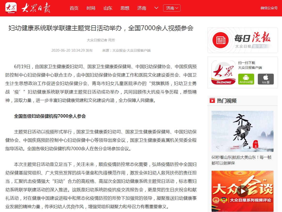 大眾日報:婦幼健康系統(tǒng)聯(lián)學聯(lián)建主題黨日活動舉辦,全國7000余人視頻參會