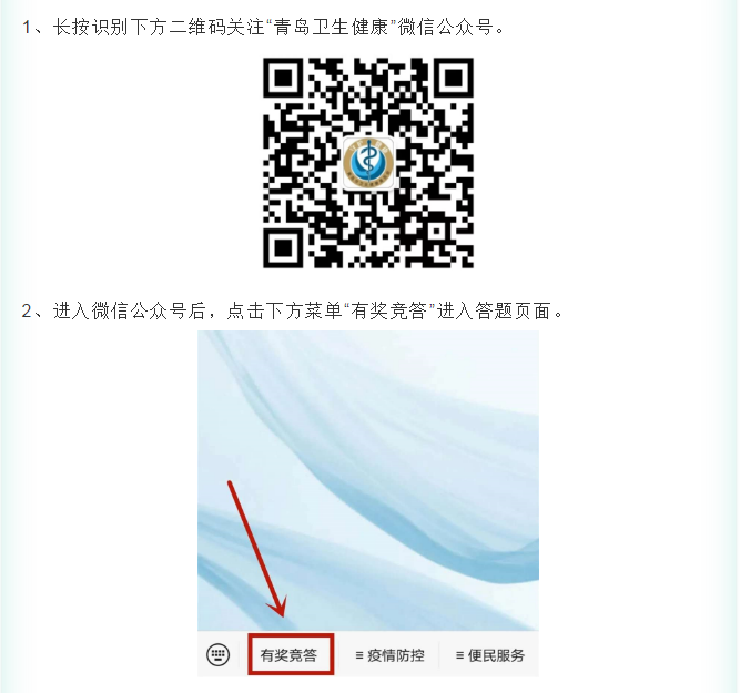 第一、二、三期獎品領(lǐng)取地點為各區(qū)市,第四、五及本期有獎競答獎品領(lǐng)取地點為青島市市南區(qū)徐州路90號青島市衛(wèi)生健康宣傳教育中心(聯(lián)系電話:80926562);青島市香港中路17號市政府三期1609房間(聯(lián)系電話:85912597),待本期答題結(jié)束后,將通過“青島衛(wèi)生健康”微信公眾號及時發(fā)布各期中獎名單及獎品領(lǐng)取時間,祝您身體健康!