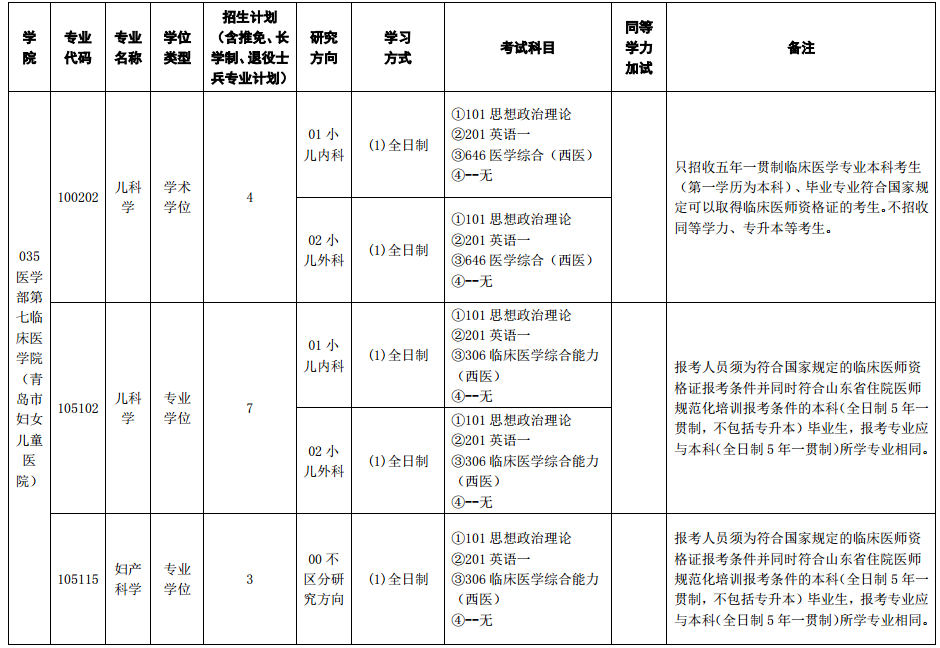 青島大學(xué)2021年碩士研究生招生專(zhuān)業(yè)目錄-035醫(yī)學(xué)部第七臨床醫(yī)學(xué)院(青島市婦女兒童醫(yī)院)