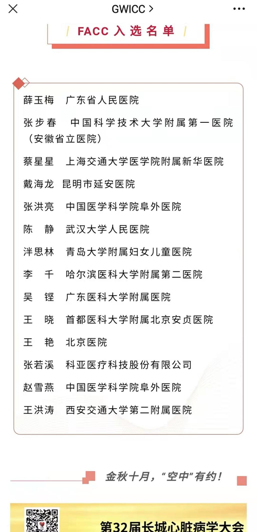 ACC成立于1949年,是目前全球最具影響力的國際性心血管病專業(yè)組織,也是世界最頂級心臟病專業(yè)技術(shù)學(xué)會(huì)。該學(xué)會(huì)是全球衛(wèi)生政策、標(biāo)準(zhǔn)、臨床指南制定的倡導(dǎo)者,世界上絕大部心臟相關(guān)疾病的權(quán)威診療指南均由該協(xié)會(huì)制定。ACC委員需經(jīng)資格認(rèn)證委員會(huì)嚴(yán)格審查,授予全球在心血管醫(yī)學(xué)領(lǐng)域做出突出貢獻(xiàn)、具有強(qiáng)大影響力的心血管病專家。