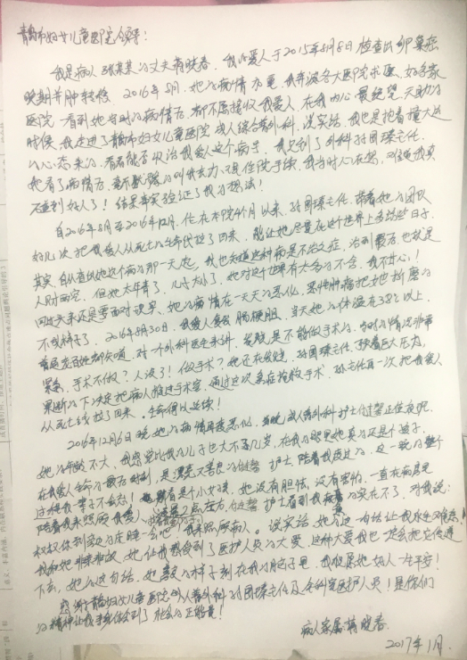 2017年1月6日,綜合普外科收到一封患者家屬親自送來(lái)的感謝信,寫信人叫蔣曉春,他用質(zhì)樸真誠(chéng)的語(yǔ)言記錄著自己內(nèi)心的真實(shí)感受,道出了一個(gè)催人淚下的故事。
