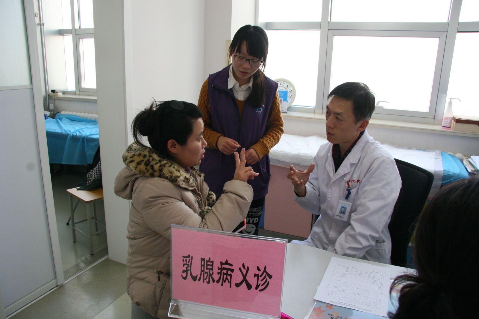 二是針對(duì)聽(tīng)障人士開(kāi)展乳腺病免費(fèi)義診活動(dòng)。自今年10月份醫(yī)院開(kāi)展手語(yǔ)志愿服務(wù)以來(lái),先后開(kāi)展了醫(yī)務(wù)助聾志愿者手語(yǔ)培訓(xùn)、聽(tīng)障人士知識(shí)講座等一系列助聾服務(wù)活動(dòng),并開(kāi)通助聾門(mén)診,為聽(tīng)障人士提供便捷的就醫(yī)綠色通道。在“國(guó)際殘疾人日”,醫(yī)院推出乳腺病免費(fèi)義診活動(dòng), 為60余位聽(tīng)障女性進(jìn)行免費(fèi)查體和超聲檢查。