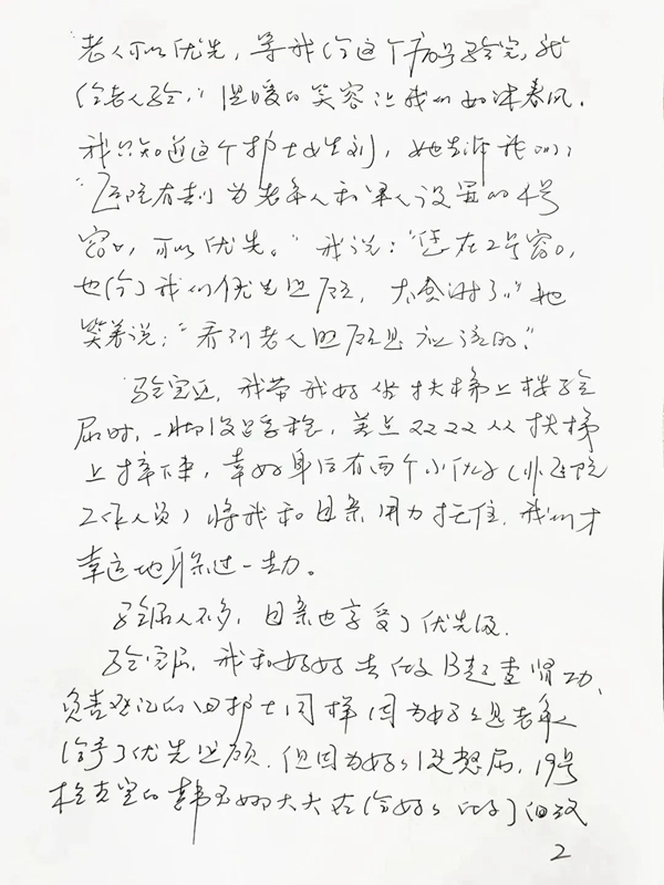 事情經(jīng)過是這樣的:我母親已82歲,因腿部有疾患行動不便。當我試著與成人中醫(yī)科主任尹愛兵溝通能否照顧一下老人優(yōu)先就診時,尹主任在異常繁忙的情況下,為我媽進行了優(yōu)先看診,非常耐心細致,叮囑我們如何做進一步檢查,令我和父母親非常感動。隨后,我?guī)赣H到負二樓化驗血,看到那么多排號等號的患者,我和母親站在驗血窗口前正猶豫時,2號窗口的護士招呼我和媽媽:“老人可以優(yōu)先,等我給這個患者驗完,就給老人驗?!睖嘏男θ葑屛覀內玢宕猴L。我只知道這名護士姓劉,她告訴我們:“醫(yī)院有專門為老年人和軍人設置的4號窗口,可以優(yōu)先。”我說:“您在2號窗口,也給了我們優(yōu)先照顧,太感謝了?!彼χf:“看到老人,照顧是應該的?!?/p>