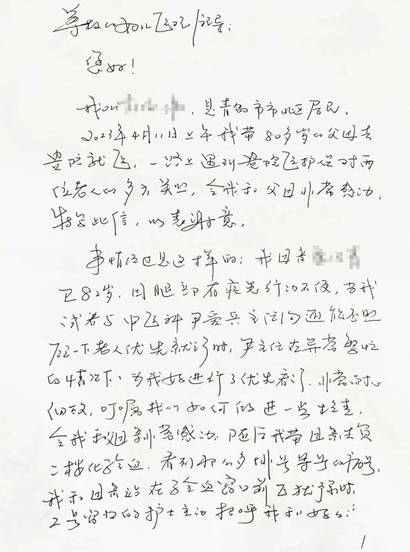 2023年4月11日,我?guī)?0多歲的父母到青島婦兒醫(yī)院就醫(yī),一路上遇到貴院醫(yī)護人員對兩位老人的多方關照,令我和父母非常感動,特寫此信,以表謝意。
