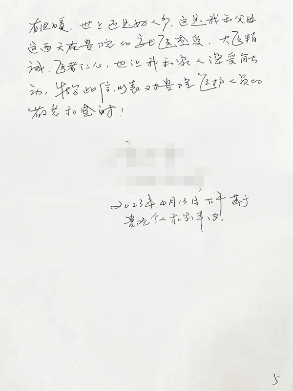 “視病人為親人,將心比心,我們?yōu)橘F院醫(yī)護人員的優(yōu)良作風點贊!人間處處有溫暖,世上還是好人多,這是我和父母這兩天在貴院的就醫(yī)感受。大醫(yī)精誠,醫(yī)者仁心,也讓我和家人深受觸動。特寫此信,以表對貴院醫(yī)護人員的敬意和感謝?!备兄x信的最后這樣寫道。
