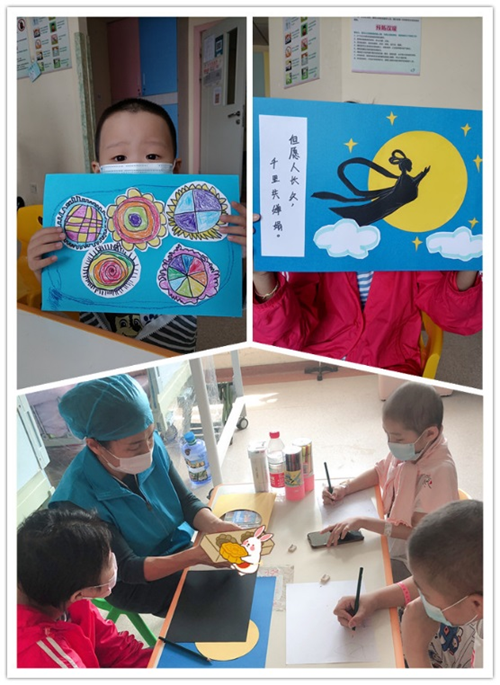 愛(ài)暖學(xué)堂專職教師徐老師從嫦娥奔月的神話故事講起,伴著孩子們的無(wú)限遐想,開(kāi)啟了玉兔花燈的制作之旅。志愿者老師從患兒喜歡畫(huà)畫(huà)的特點(diǎn)入手,啟發(fā)患兒以月餅、月亮等與中秋節(jié)有關(guān)的元素為主題進(jìn)行剪貼畫(huà)創(chuàng)作,并在過(guò)程中教會(huì)孩子相關(guān)的古詩(shī)詞,寓教于樂(lè),令患兒們耳目一新。