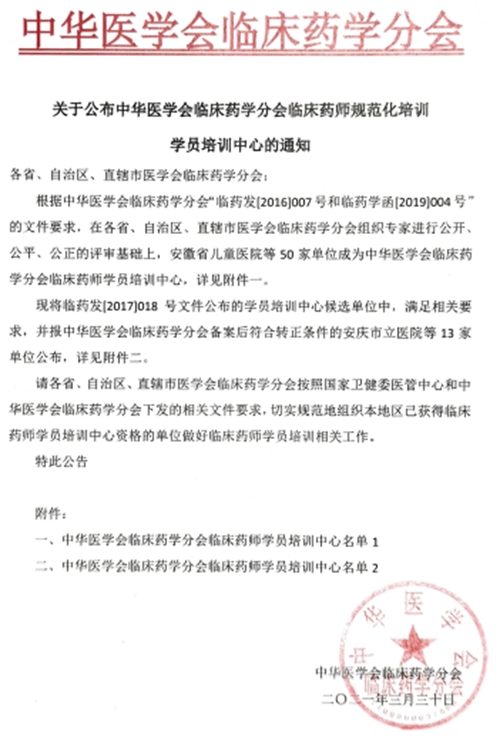 為加快臨床藥師規(guī)范化培訓進程,進一步提升醫(yī)院藥師的臨床服務技能和專業(yè)水平,經(jīng)中華醫(yī)學會臨床藥學分會的嚴格審核,我院于2021年3月正式獲批為中華醫(yī)學會臨床藥學分會臨床藥師規(guī)范化培訓學員培訓中心。